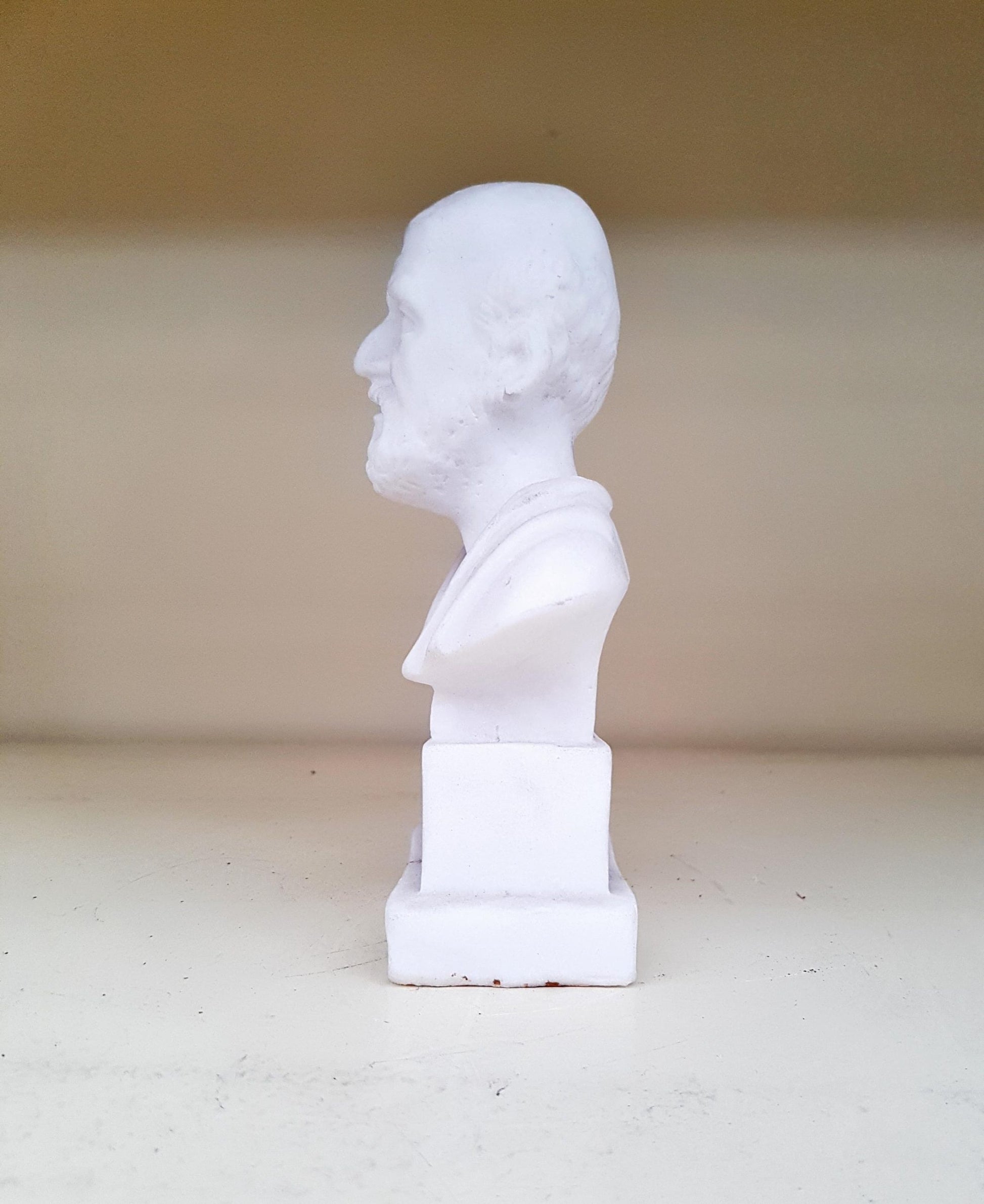 - Релефна портретна точност – детайлният бюст пресъздава емблематичния образ на Хипократ с внимание към контури и пропорции, придавайки авторитет и достоверност на витрината или бюрото ви.