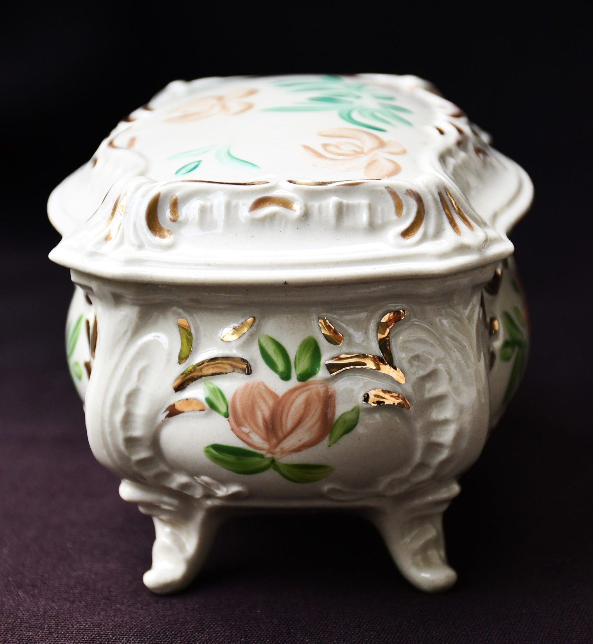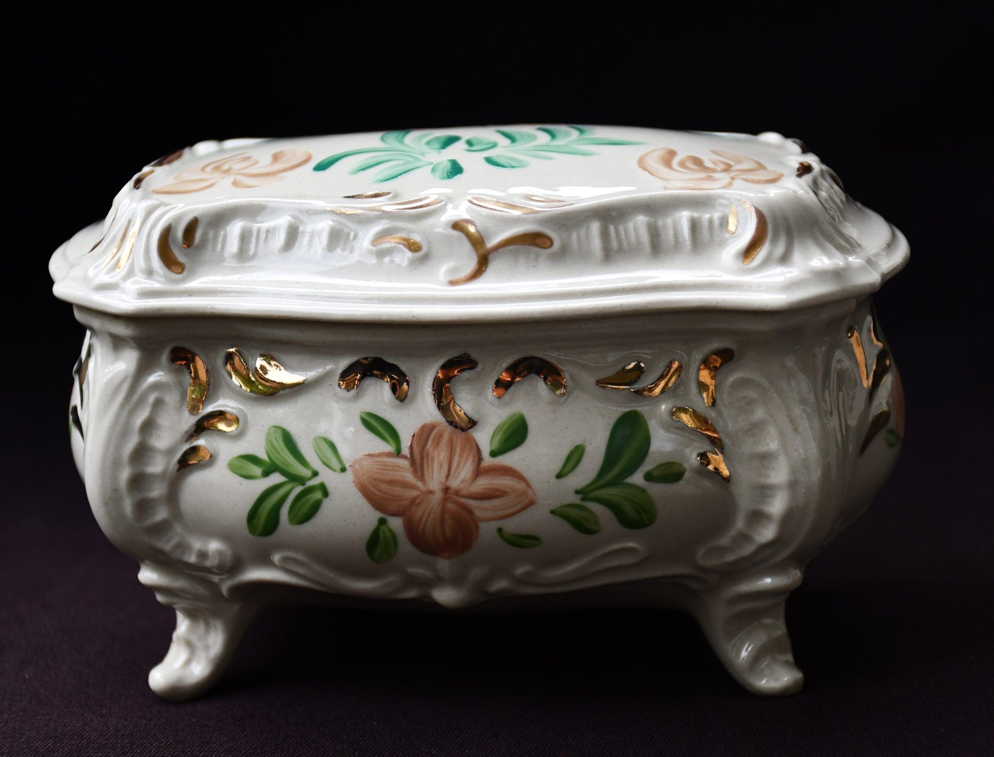 Тази кутия е изработена от фаянс — материал, който комбинира здравина с нежна глазура и характерен ръчноправен почерк. Всеки детайл е завършен с внимание към формата и пропорциите, което я прави уникална част от колекцията ви. Предпочитанието към българската керамична традиция й придава не само функционалност, но и историческа стойност, която се усеща във всеки проскърцан ръб и всеки плавен ъгъл.