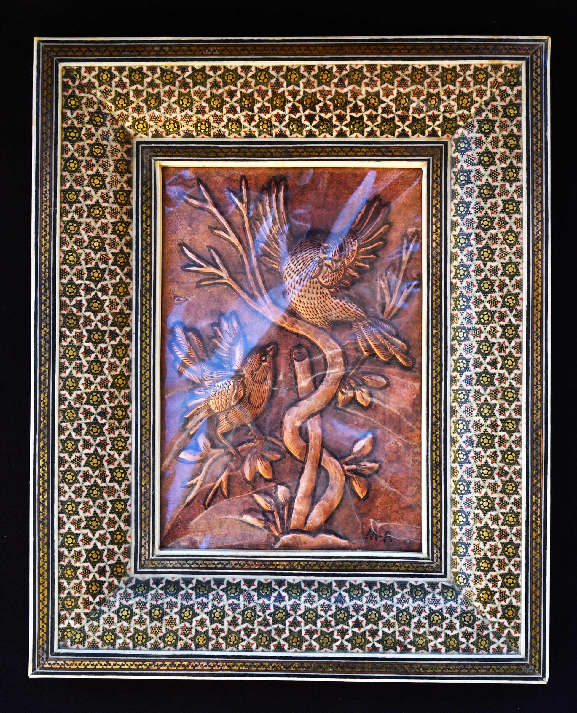 Персийски меден релеф в рамка "хатам" е уникално стенно изкуство, което пренася духа на вековната персийска традиция хатамкари в съвременен интериор. Релефът е внимателно изработен ръчно, като играта на светлина по повърхността подчертава всяка геометрична детайлност и дава топлина на всяко помещение. Рамката допълва композицията с изискана форма, която пасва идеално на различни стилове – от класически до модерен офис или уютен хол.